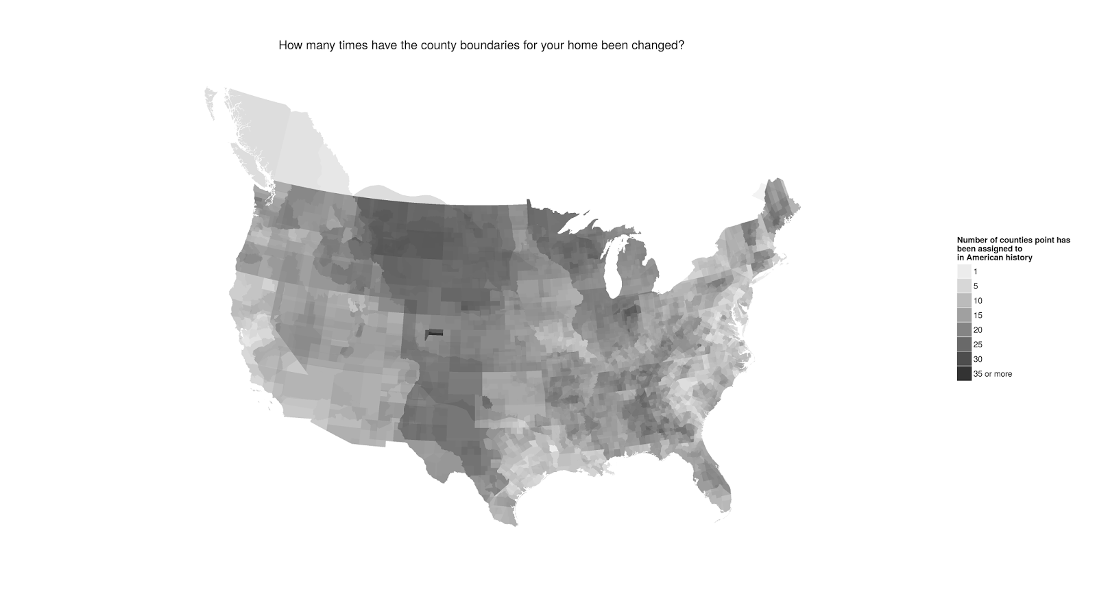 Since there’s a separate shape for every re-legislation of a county’s borders, plotting each one with fixed alpha means that the dark areas are those in places where county lines have been drawn and redrawn.