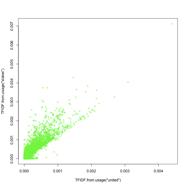 How high is a .13 correlation? It’s probably not nothing. For more highly linked word-pairs like “Lincoln–Springfield,” “Kansas–Nebraska,” or “Red-Green” the correlations are between .45 and .5. The highest score I could get was this graph, with a correlation of .91, for “united” and “states”.