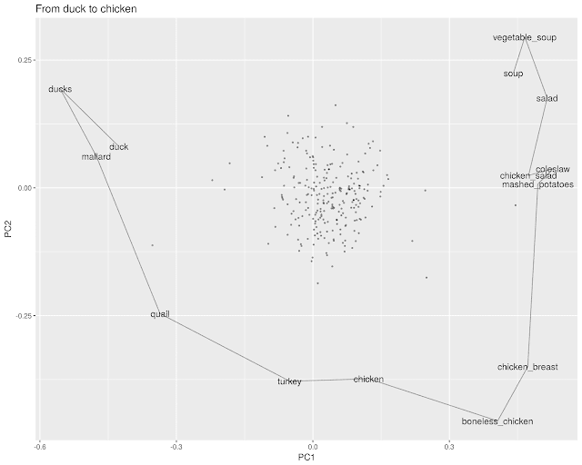 3. Repeat the process to find words between duck and chicken. That, in this corpus, turns out to be quail. The vector here seems to be similar to the one abovequail is food relatively more often than duck, but less overwhelmingly than chicken.