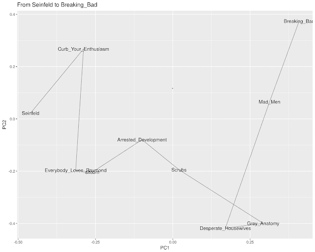 As this suggests, theres a certain kind of deep cultural knowledge built into the co-occurrence networks of news articles that word2vec trains on. The path from Seinfeld to Breaking Bad, for example, initially realizes that Curb Your Enthusiasm mediates between the 90s show and the Golden Age of television; and then sets about bridging the drama-comedy divide by finding its way into the primetime soaps through Scrubs out of the comedies and Mad Men out of the dramas.