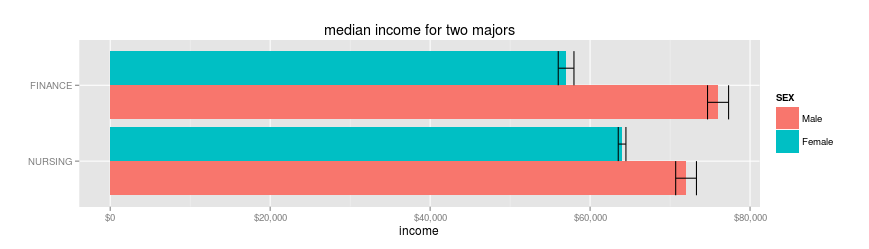 So why the difference? Because there are hardly any men who major in nursing, and hardly any women who major in finance, so the median income ends up being about male wages for finance, and about female wages for nursing.